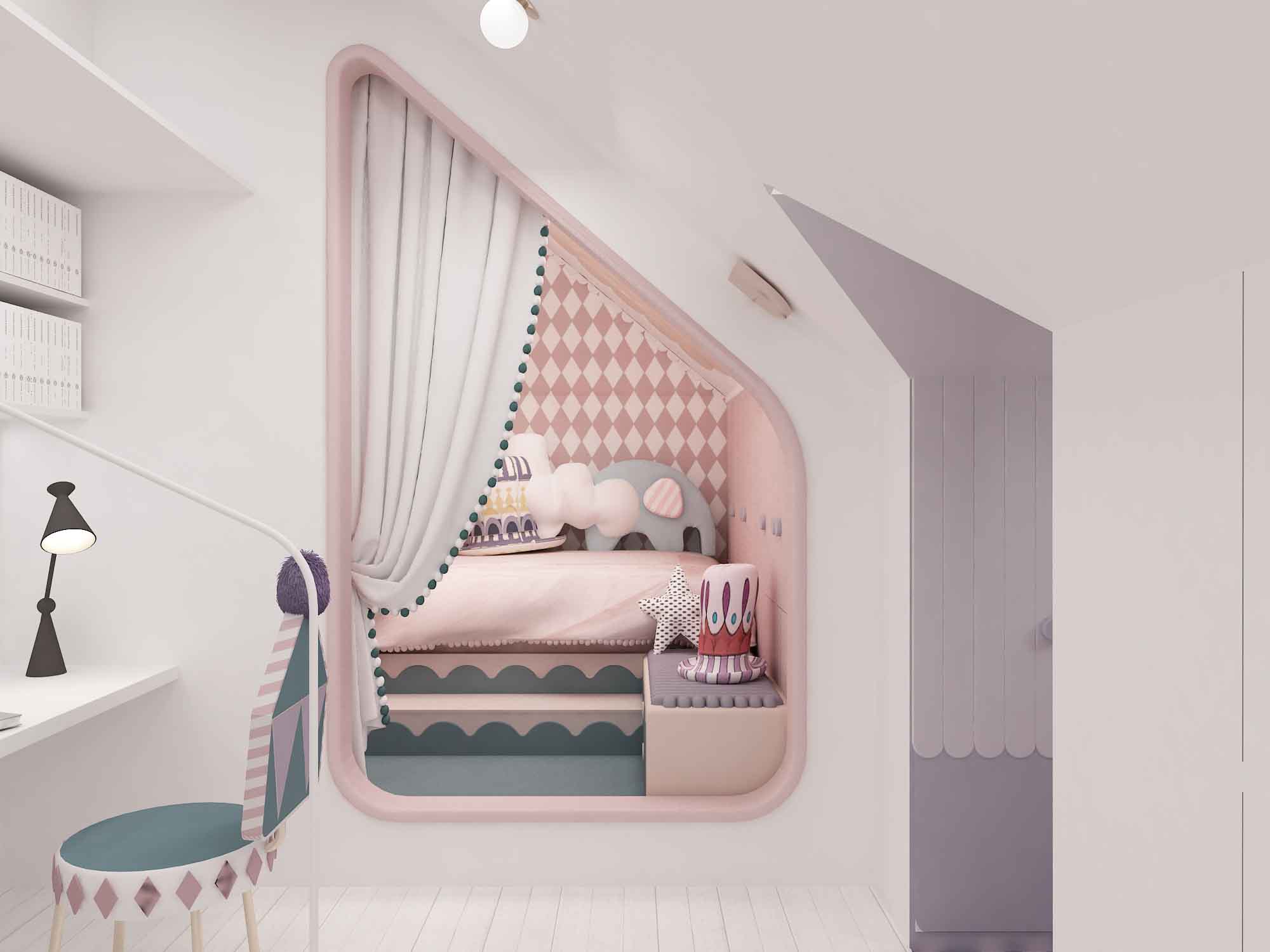 The boy's room uses the robot that the little boy loves as the design theme. Through minimalist geometric reorganization and line drawing, it depicts a child-fun room. The girl's room is based on soft pink colors and uses cute wave patterns as decorative border on different kinds of furniture, creating a delicate and exquisite dreamy princess room.