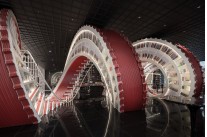 The concept area is located at the corner of the building, with a large glass façade that breaks the spatial barrier between the interior and exterior, dissolving the boundary between the interior and exterior views and enhancing the expansiveness of the space, allowing consumers to appreciate the retail space from outside, which is almost occupied with a huge art installation. It frames the scene to portray an inclusive and open storytelling magnetism and urban temperament. In this artistic space, time seems to become tangible. A massive spiral staircase which is actually a bookshelf lying on its side on the ground, running in a curved trajectory through the entire concept area and connecting the entrance and exit.