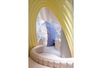 Under the ten-meter height space, the designe`r created an elegant and enthusiastic image of an ocean dance party inside the private dining space with a three-dimensional hierarchical spatial structure, and covered it with cream-like delicate and elegant colours. Colourful fishtails stood still at a moment of swaying, and wrapped into half-fan shaped blocks that separate dinning tables. Wavy raffle patterns are adorned on the stairs, platforms and the edge of the bar. The stairs and platforms connect the whole space, and the a play area is cleverly placed inside it. The interactive play and companion space makes the dining journey of each family more delightful and interesting. The washbasin in the bathroom are custom designed with sea anemone shaped mirrors and countertops of different levels, which satisfies the needs of different groups of people. The church-style skirt lines sets off a grand sense of ceremony.