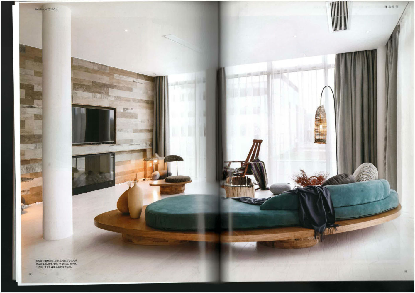 每一间客房,为表达水的动与静,我们将沙发设计成石子接触水面的画面,并在空间中精心布置了每一颗石子、鱼篓等,确定了构图中的主次。