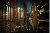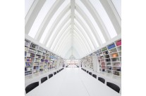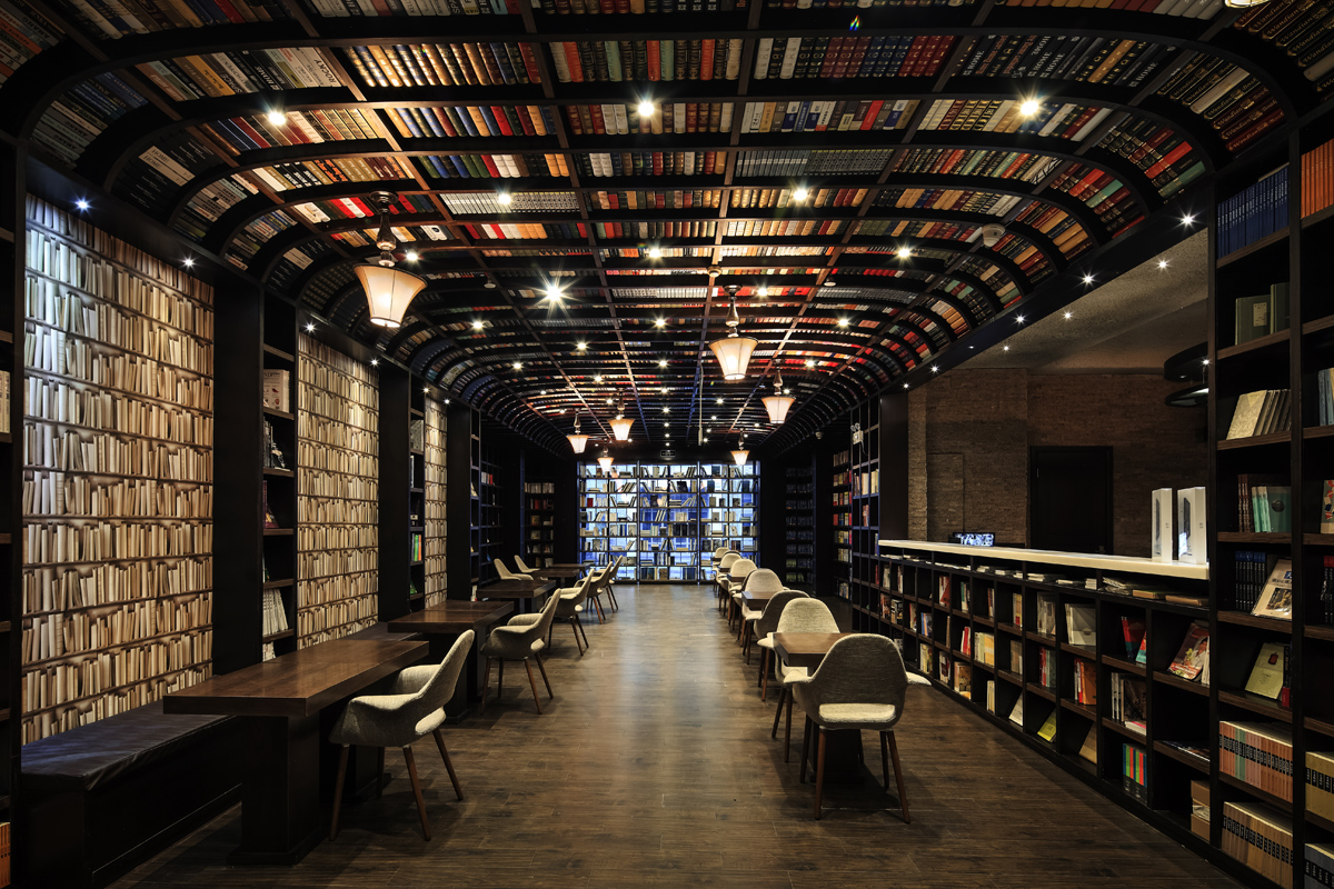 进入大门即钟书阁二期里面的中央阅读博物馆,书架从墙壁延续了空中再从另一边的墙壁落下,形成了一个如宫殿般的拱形书籍空间,你会看见许多倒置的台灯悬在空中。