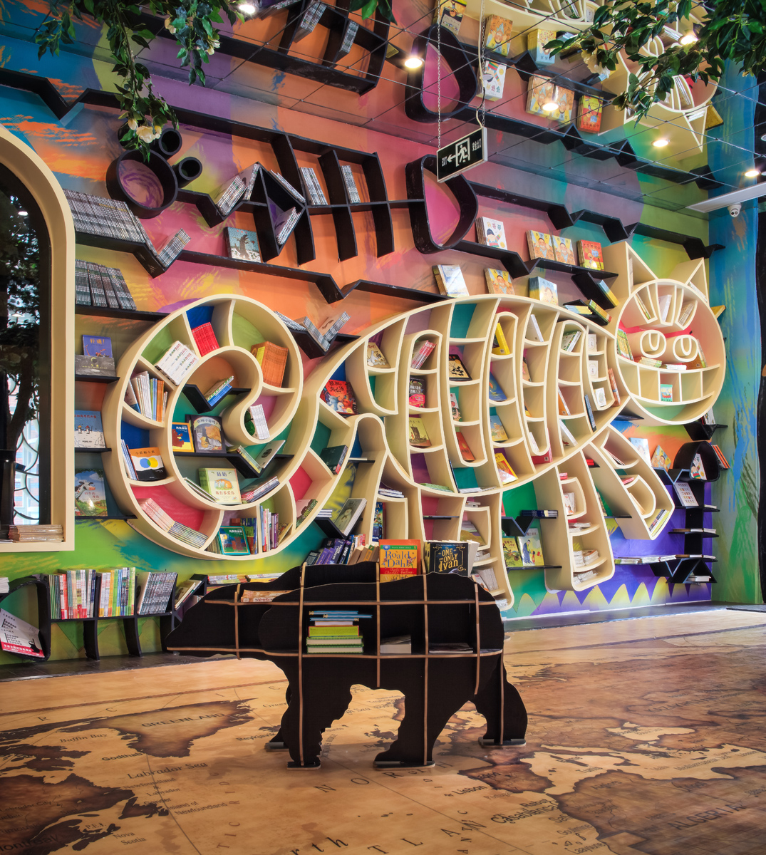 墙面用幼稚线条勾勒出不同的动物图案,就是这里的书架,动物们略带调皮与幽默的表情,展现出孩子般的单纯与快乐。地面的地图上同样站立着各种动物,它们既代表了不同大洲上的生物也是书架。