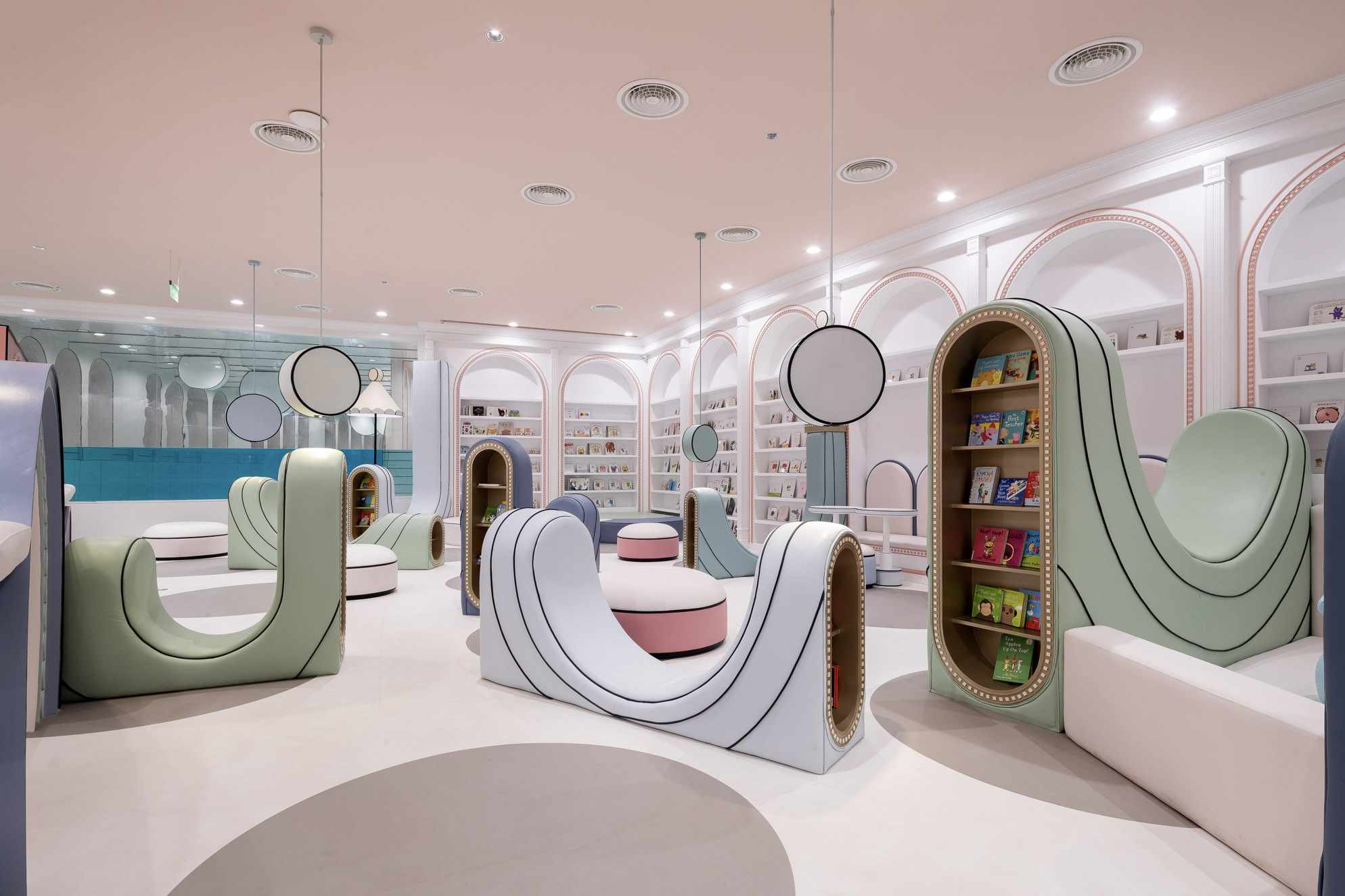 整个亲子游泳馆仅采用了温柔的色感,并不刻意做性别上的色彩取向区分。黑色细线描边的设计手法,给整个略显轻飘的空间底色增添了几分时尚先锋感,从构图上来讲,同时也成就了平面美学。 从小至两厘米的圆拱形花边到挑高三米的圆拱弧门,统一、极简的设计元素,通过大小比例的调整运用,从大尺度覆盖到小尺度,构成了空间中的美学比例逻辑。 无特别照明的设计,意图强调整个空间无重点便是最大的重点,以打造一种沁入式的梦幻体验。