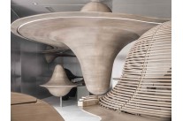设计师以写意派的手法呈现了“云山”这一设计母题,在围合的有限空间内挥洒出了一副清雅秀丽的山水画。连绵的山形在垂直与水平空间内自然延展,设计师又借由倒影的意象把山幻化成了云,两种自然符号恰如其分地描绘出了竹叶青的自然生态产地。山与山之间的连接,优美的弧线柔化了体块的庞大,仿佛被云雾轻盈地托举而起。既满足了摆放的功能需求,又补足了空间内美学构图的丰富度,为消费者提供了多样化的观赏视角。