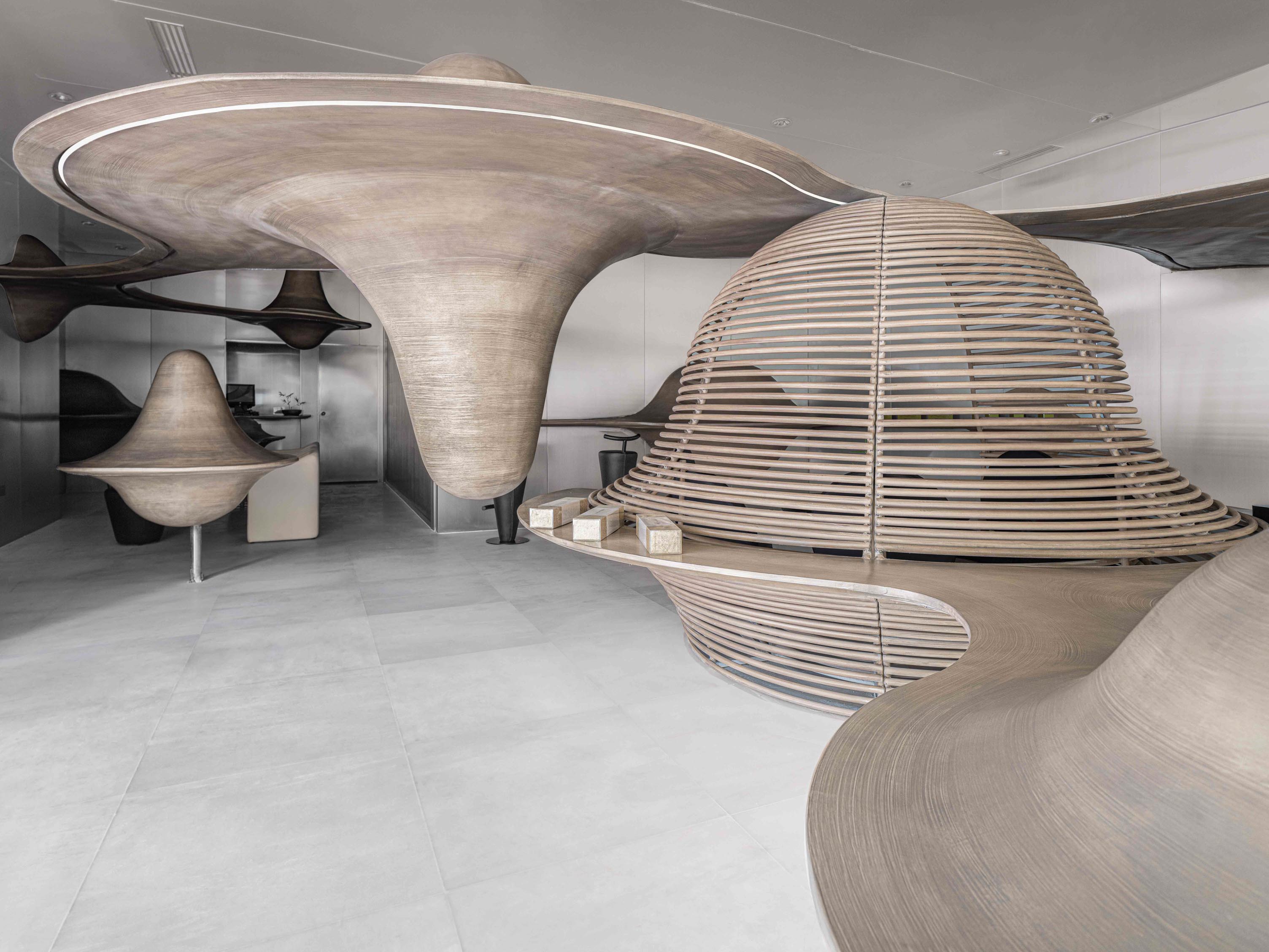 不锈钢材料的大面积使用为空间涂上了一抹现代诗意,金属的质感与色泽仿佛氤氲于纸上的水墨,研磨出了完美演绎“云山”主题的空灵底色。设计师这一对茶饮体验风格化消费方式的全新探索,突破了传统形式,从空间设计入手提供了丰富的感官愉悦点,全方位调动消费者的五感,让完美体验感达至饱和。