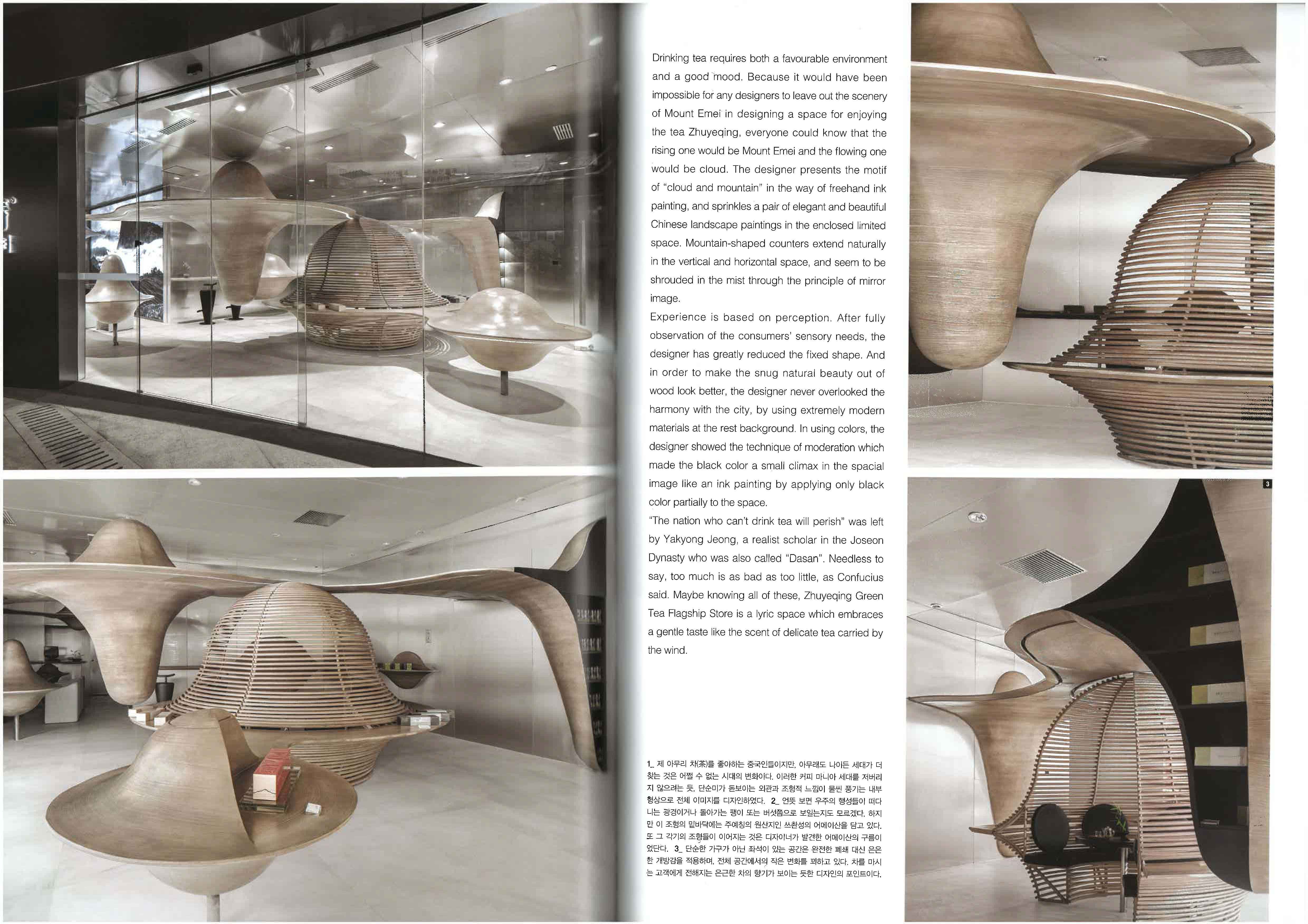 高低错落、左右穿插的功能体块被精心布局于消费者动线之上,引导性地开辟出了一条完整的体验探索路径。设计师同时利用了有限的层高,打造了一处位于二层的清静雅座。行走在空间里,仿佛穿行于云雾中,既能体味仙游山水间的悠然自得,又能享受闲坐幽山中的洒脱兴致。