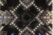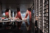 高尔基说过:“书籍是人类进步的阶梯。”拉斐尔也曾在名画《雅典学院》中让代表着哲学、数学、音乐、天文等不同学科领域的文化名人会聚于阶梯前探讨知识。设计师提取出智慧阶梯的美好寓意,将论坛区典雅庄重的书架整合为绵延的阶梯,砌筑出神圣的知识殿堂。叠加的门洞造型和富有层次感的地面动线言明了知识殿堂丰富多彩,深邃宽广的精神内核。简洁的灯具散发出柔和的光线烘托整个场所的温暖氛围。充满悬浮感的摆台丰满了超现实主义设计的骨肉,带给读者一些奇幻的想象与感受。