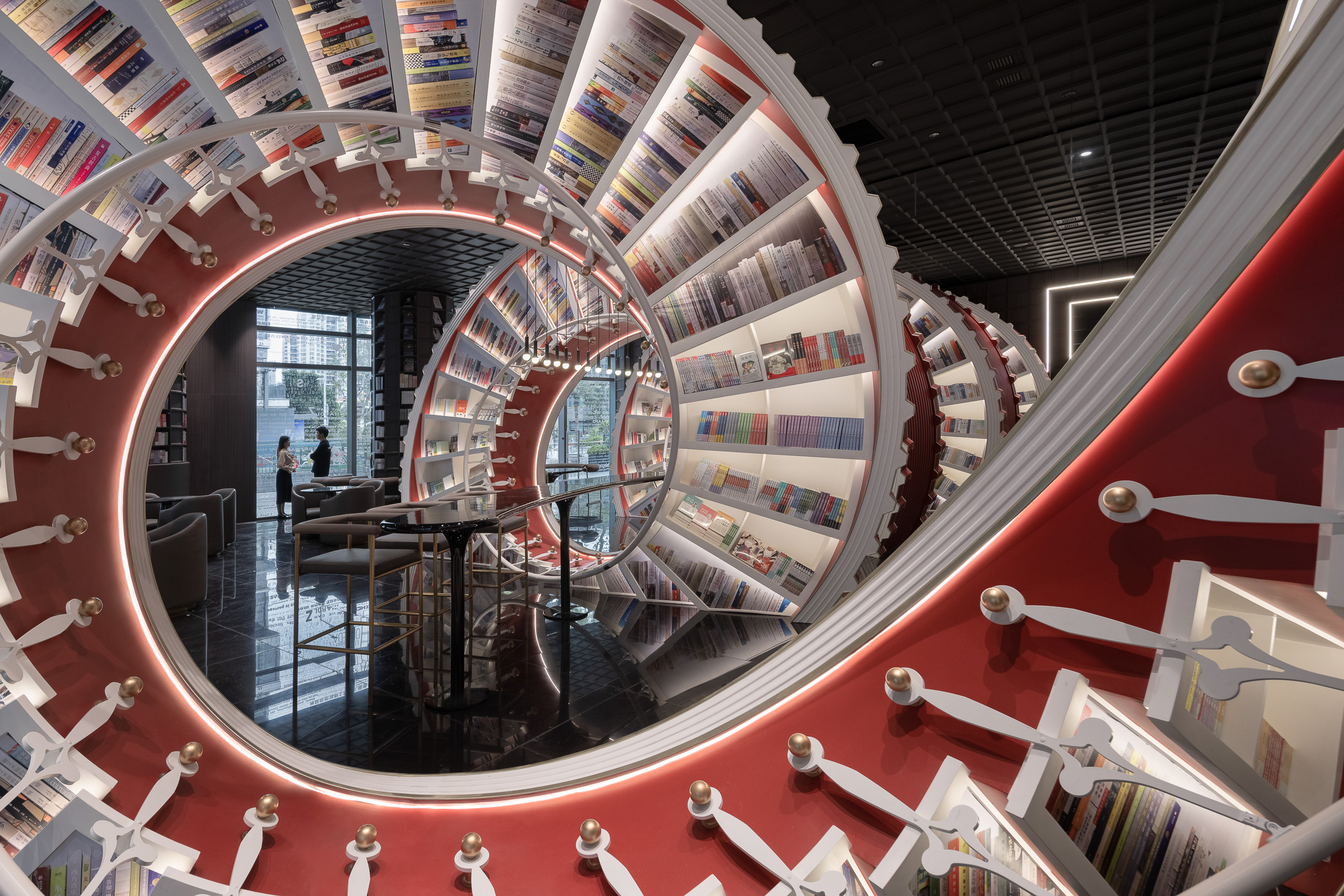 历史的发展是螺旋曲折的,奋斗者为推动社会进步的历史轨迹被凝结成象形的螺旋阶梯,重复扁平的生活下,他们有滴水穿石,持之以恒的毅力。大面积的橱窗设计让精致内景一览无遗,为消费者带来一场感官上的饕餮盛宴,在消费者的心底映射出深刻的品牌印象。设计师不拘一格将商业与艺术融合的设计手法,打破了空间拘泥于功能的单调属性桎梏,传递出品牌的价值取向,为消费者的购物体验带来更新奇的场所基因,也是对未来商业空间进化形貌的一次开拓性尝试。深圳钟书阁不但是一个致敬城市奋斗者的纪念之地,也是学习知识探求智慧的疗愈之所,它是深圳无数小小缩影中的其中一个,容纳不安,容纳巨大。
