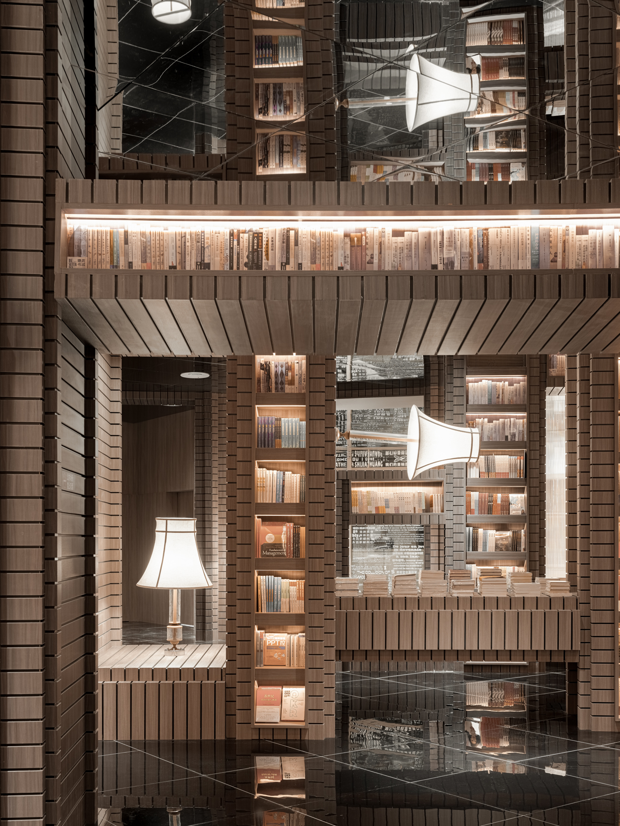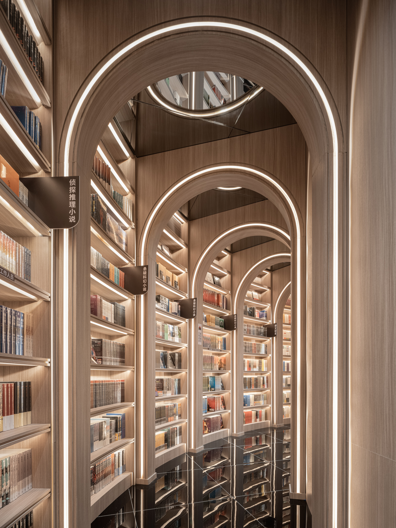 环绕论坛区一周的阅读景观长廊布满了等距的拱形门洞,生成充满阵列美感的端景,沉淀出深邃的秩序之美。点缀在书架和长廊拱形门洞上的灯带排列出一首光辉的线条之诗,加深空间的层次感。沿环状动线进入文创长廊,消费者在经典的镜面天花板和黑色瓷砖地面包裹中,体味到空间的通透和沉静。