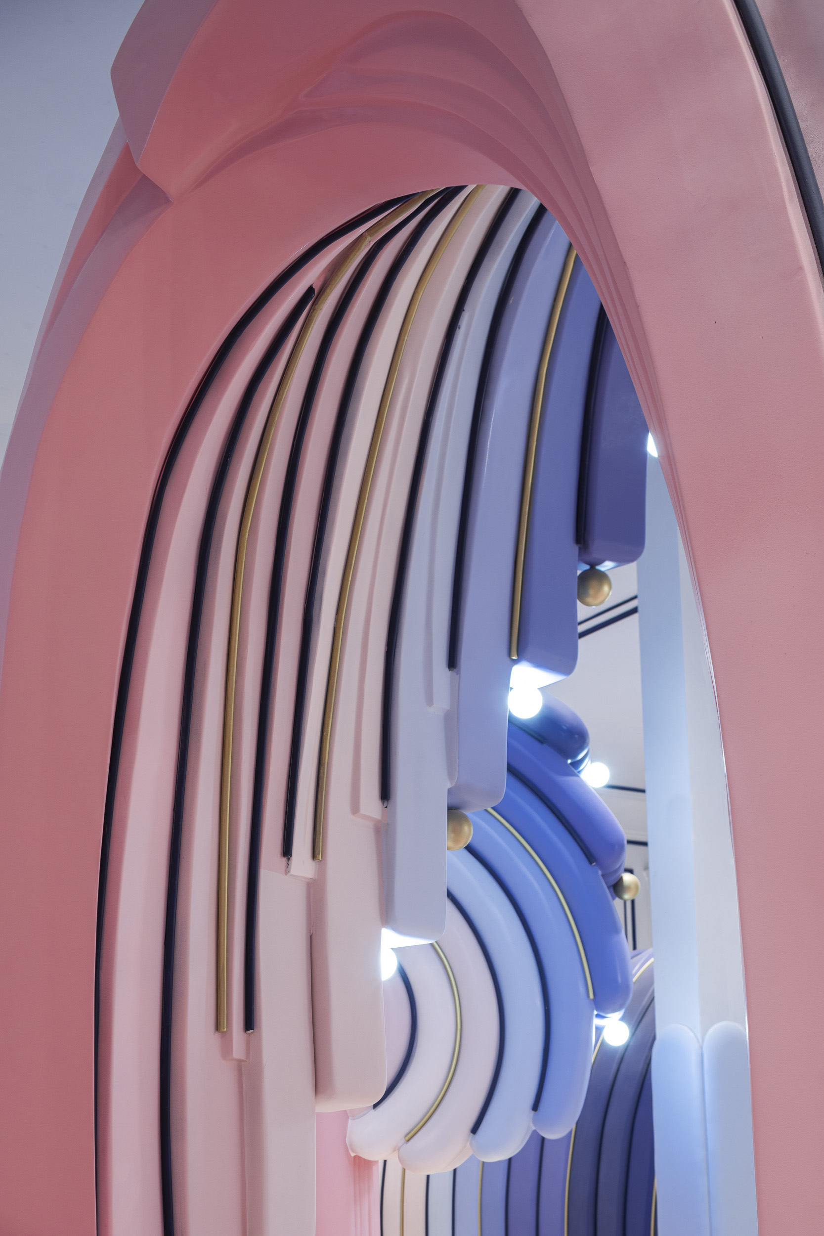 当客人步入接待换鞋区,聆听眼前海洋的潮汐奏鸣。设计师将功能和美学统筹为整体,艺术性地提炼浪花元素演化为鞋柜与服务台。形如彩虹的甜美浪花在室内翻腾,堆叠出瑰丽的海面,以多功能L形前台为中心的单向动线串联了接待区和零售区,并激活服务台对双区的服务属性。