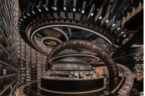 设计师打破钢筋水泥的重复和无趣,利用夸张的立体构成重塑庞杂精妙的天体仪器,在有限的室内创造星环缠绕的天文奇观。有如从星海缓缓升起的天文仪器,释放奇妙的引力,萦绕的灯带洒下缥缈光影。黑色木纹书架墙与大理石细腻纹理共同勾画出无边际的太空,异形构筑物错落排布,似乎也遵循天体间的运动规则,组成一个个精密的、巨大的机械零部件。