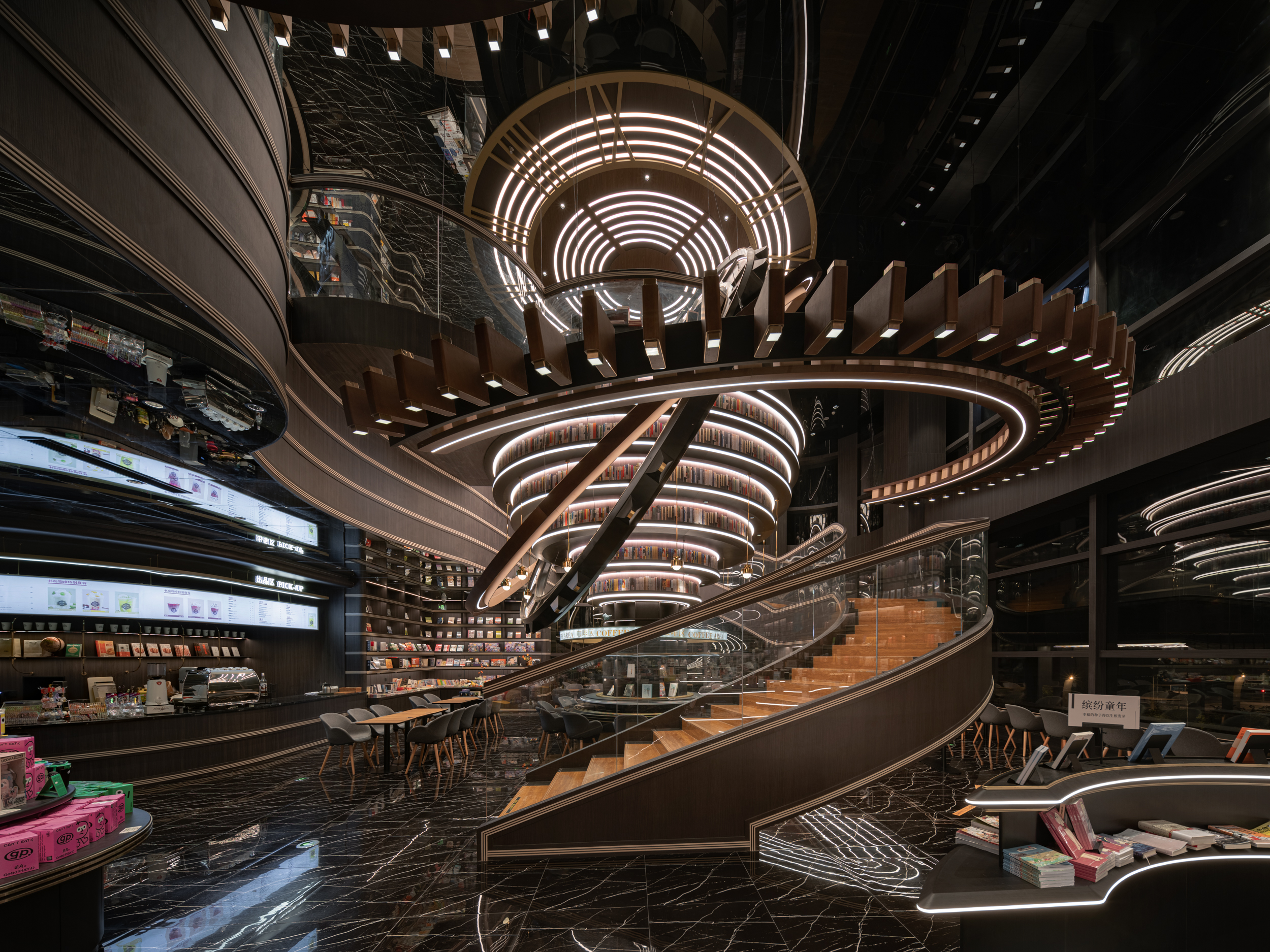 在人潮汹涌的闹市商场里,一个巨型天体装置从天而降,仿若来自另一时空的魔幻感侵入枯燥的日常生活,也渗透入原本相差无几的城市景观。淮安钟书阁的建成,便如同在繁华闹市的现实中撕开了一个时空缺口。