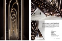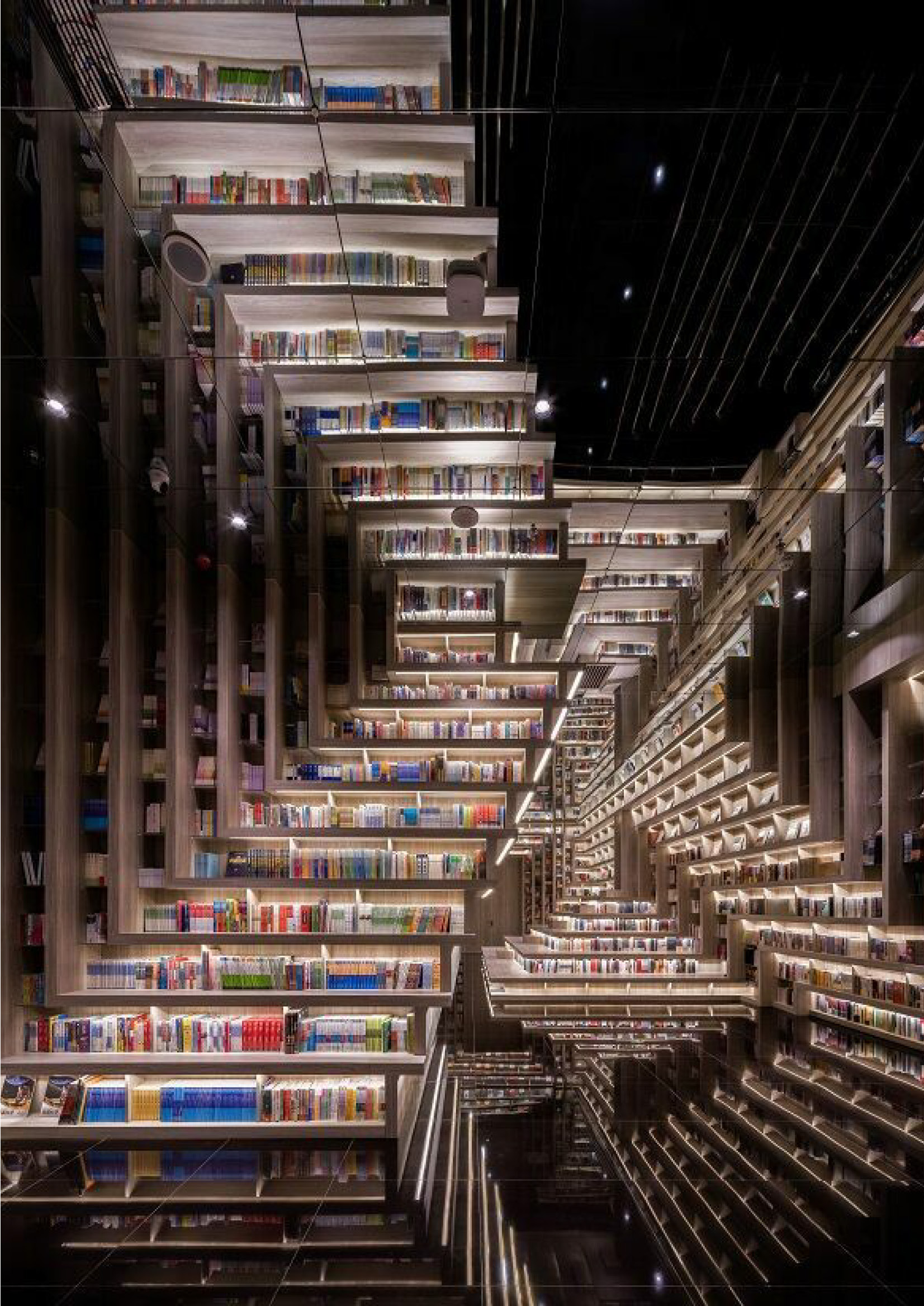 书简状的书架层层叠叠堆砌出台阶,连接的阶梯间形成隐秘而宏大的山间奇景。连绵的山岩是在地性地貌的体现,层状体块之间相互咬合、盘旋,山势随之向上伸展,意寓连绵不断的江淮大地。