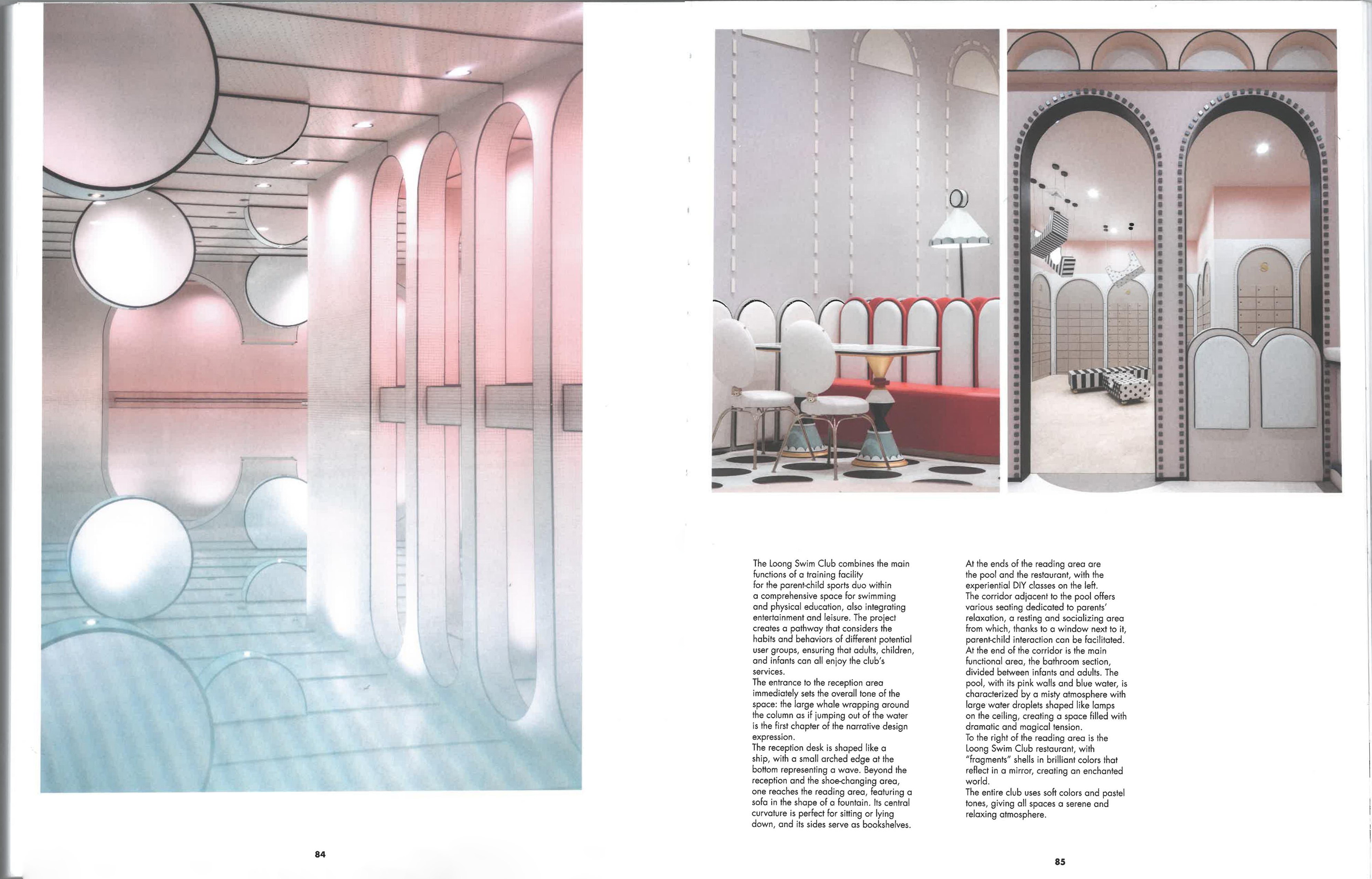 整个亲子游泳馆仅采用了温柔的色感,并不刻意做性别上的色彩取向区分。黑色细线描边的设计手法,给整个略显轻飘的空间底色增添了几分时尚先锋感,从构图上来讲,同时也成就了平面美学。 从小至两厘米的圆拱形花边到挑高三米的圆拱弧门,统一、极简的设计元素,通过大小比例的调整运用,从大尺度覆盖到小尺度,构成了空间中的美学比例逻辑。 无特别照明的设计,意图强调整个空间无重点便是最大的重点,以打造一种沁入式的梦幻体验。