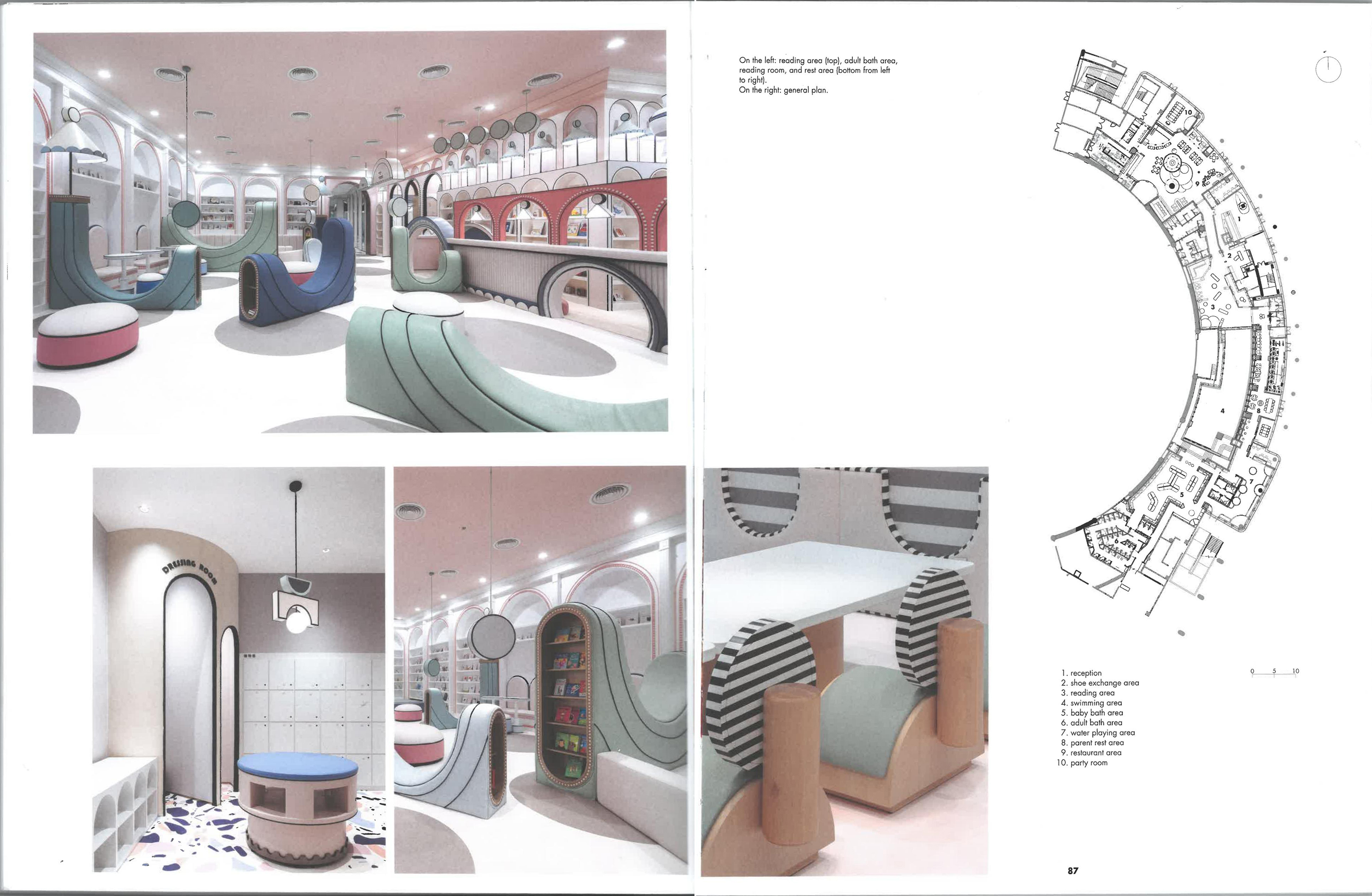 服务型商业在发展过程中结合新的功能形态是一种趋势,设计师试验性整合本项目中心业态之外的附属功能。不仅将原有主要亲子运动培训的功能重新优化落地外并将项目打造成了一个附属娱乐休闲一体的综合性游泳体育教育空间。