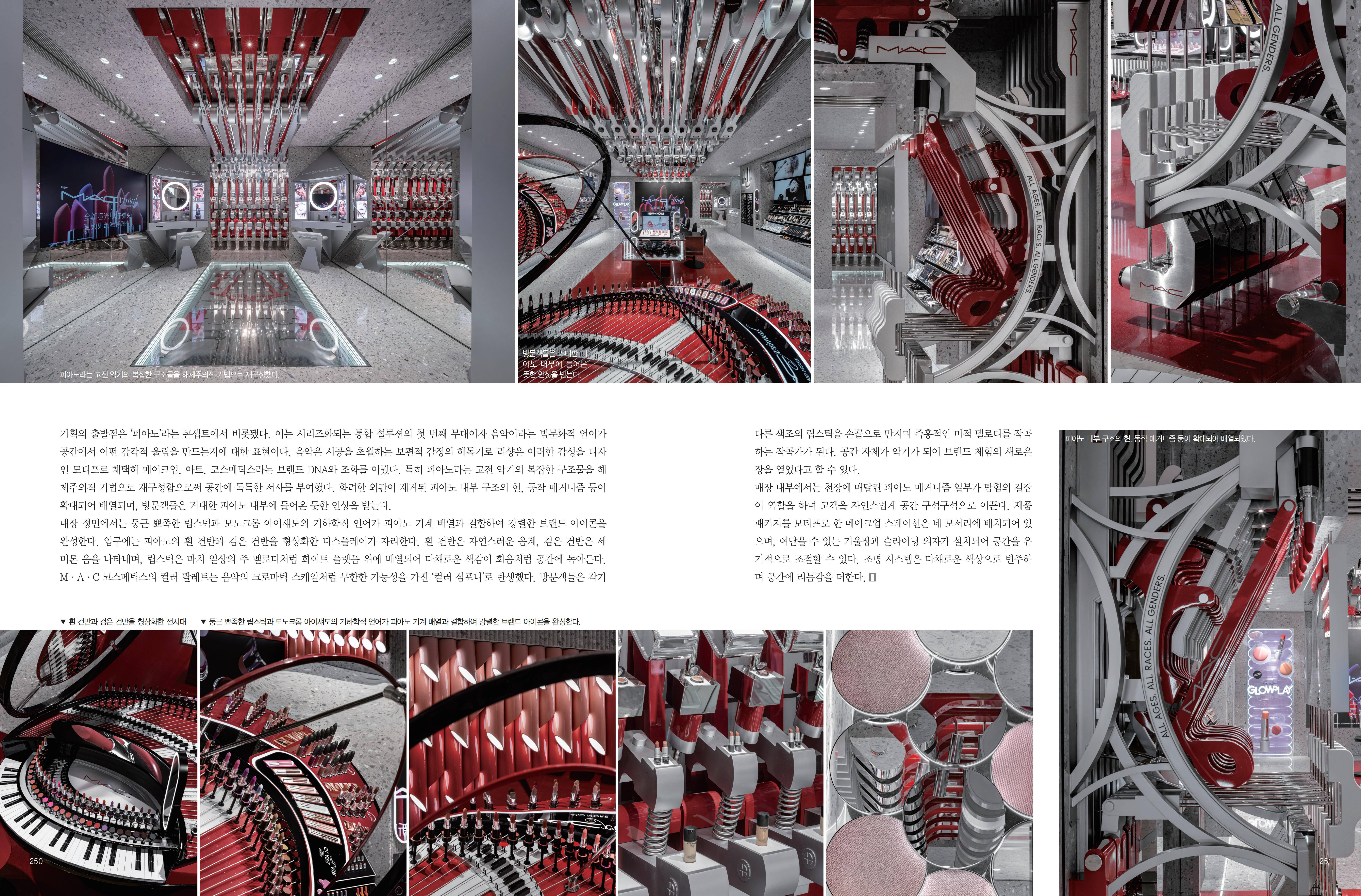 入口中心,三角钢琴的形态被解构为门店标志性的陈列装置。代表自然音阶的白键形成音乐的语法骨架,黑键以升降半音形态,拓展出旋律的复杂维度。设计师将之改写为全新的产品陈列逻辑,品牌代表性黑管唇膏分布于白色展台之上,象征口红在日常生活的主旋律中,以色彩的丰富性与变化性,如和弦般彰显多变的个性张力。MAC魅可色彩家族由此升华为可视化的谱系——正如半音阶赋予音乐无限可能,品牌通过产品的“色彩交响”,为每个个体谱写专属的美学变奏曲。这种对概念元素功能的建筑学转译,实质构建了“空间即乐器”的品牌体验范式。当消费者在艺术展台旁游走选择时,恰似作曲家指尖在琴键上编织和声网络,每一次产品触碰都是美学旋律的即兴创作。